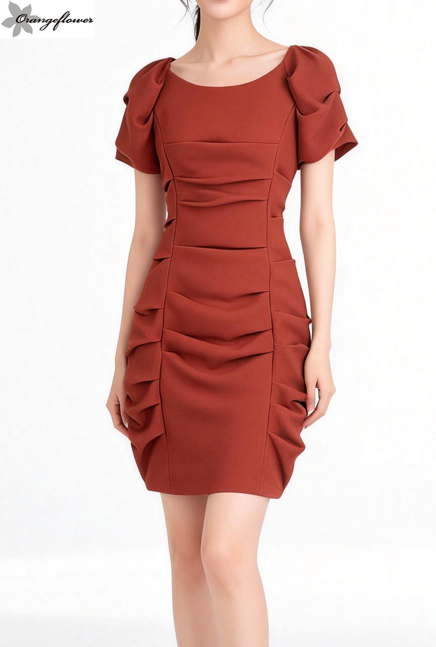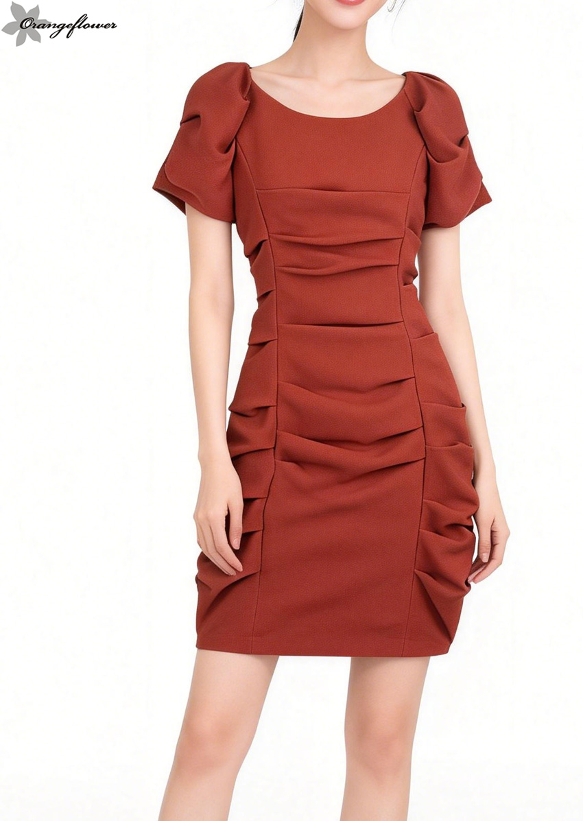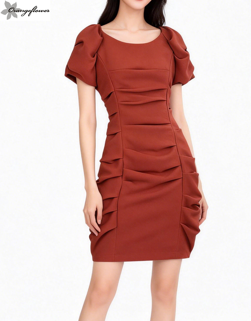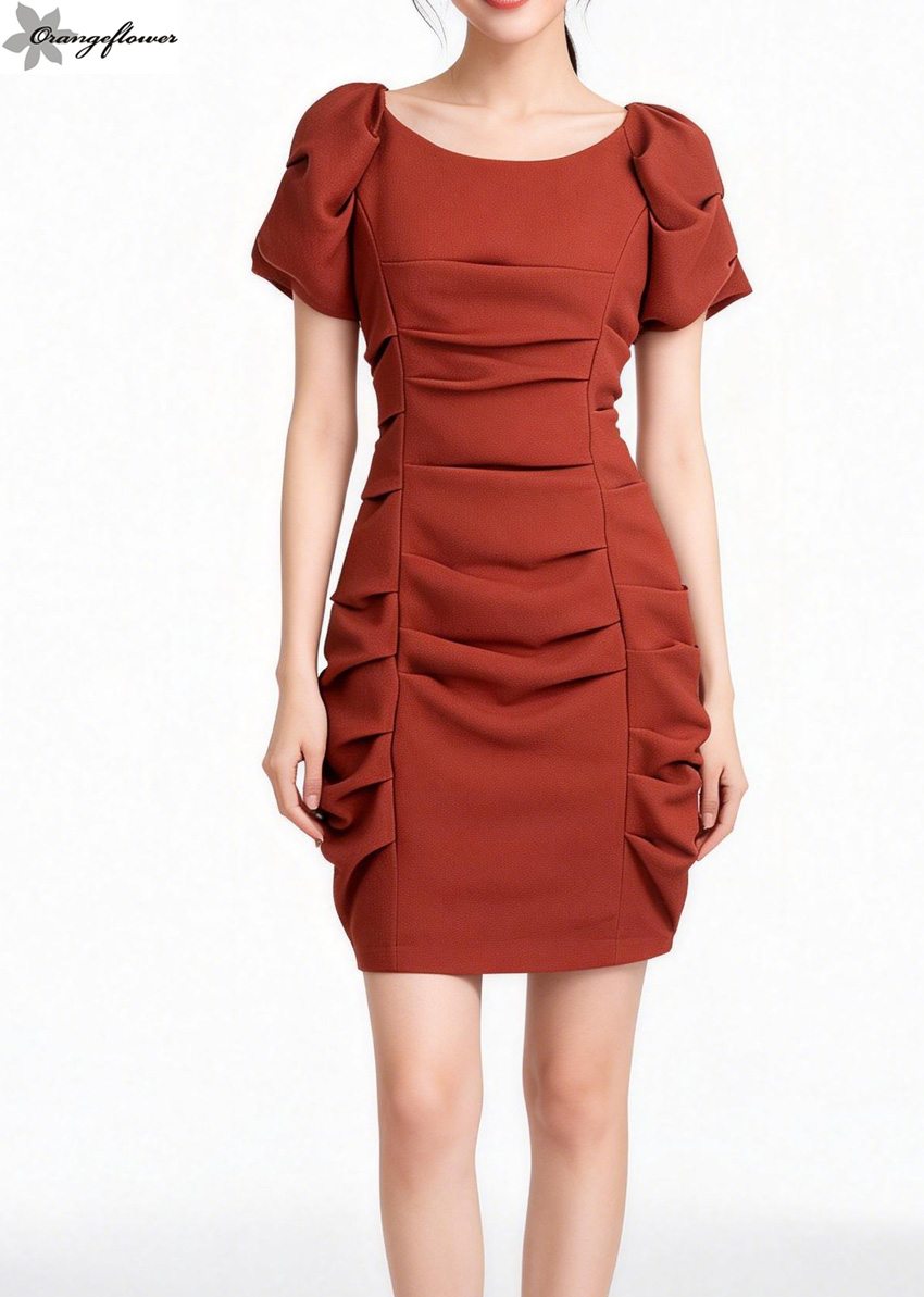 orange flower欧美风格时尚不规则褶皱短袖连衣裙